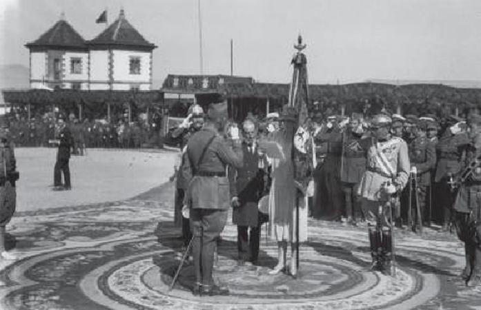 El 5 de octubre de 1927 S.M. la Reina Doña Victoria Eugenia entregaba al Tercio su anhelada Bandera bordada con sus manos y ya bañada con la sangre de los legionarios: