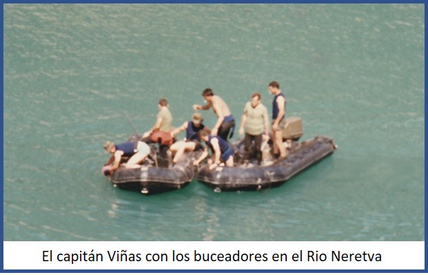 El rio Neretva a la altura del Puente de Dréznica, está embalsado. Cualquiera que entienda de buceo sabe que esta situación es muy positiva, por cuanto no hay corriente, pero muy negativa para la localización de cualquier objeto sumergido. No se distingue el fondo del fluido porque hay una capa de cieno que al mínimo movimiento de una mano o una aleta, todo se revuelve y se pierde la vista a pocos centímetros, cosa que no ocurre en el mar o en una corriente. Por eso el capitán Viñas estableció un procedimiento de búsqueda basado en “filieres” unas cuerdas lastradas de plomo, que se largan desde una embarcación en superficie procurando que discurran paralelas por el fondo a una distancia de 1,5 mts. una de otra. Al mismo tiempo todos los buceadores disponibles se distribuyeron por parejas para sumergirse sucesivamente de forma que uno de los buceadores trata de seguir la filiere con una mano, con la otra palpa el terreno. El segundo buceador toma de la muñeca al compañero y con la otra mano hace lo propio. Así pronto dimos con el primer cuerpo, el del CLP Agustín Maté, que pertenecía a la II Bandera Paracaidista, pero prestaba servicios con los zapadores. Eso nos confirmó que el sistema que utilizábamos era el adecuado y al atardecer, pudimos sacar el segundo cuerpo, el del zapador paracaidista Samuel Aguilar. El día siguiente completamos el rastreo del cauce extrayendo del fondo el cuerpo del Zapador Isaac Piñeiro. Por las noches, en aquellas condiciones, era imposible bucear.