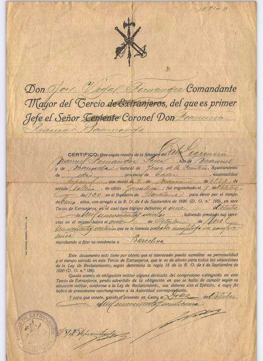 Ya nadie te dice cosas así. Aquello era verdad. Se cumplía la palabra. Ahora hay mucha mentira, te dicen y luego no es. La palabra legionaria es ley, por lo menos en el servicio, que luego cada cual es cada cual. A lo mejor ahora no gusta, no les parece bien o no les encaja que fuesen los catalanes aquellos la base sobre la que se construyó la Legión, digo yo, que tampoco es que fuese así, porque allí llegaron de todas partes y no se contaba el primero en llegar sino el primero en caer frente a los moros.
