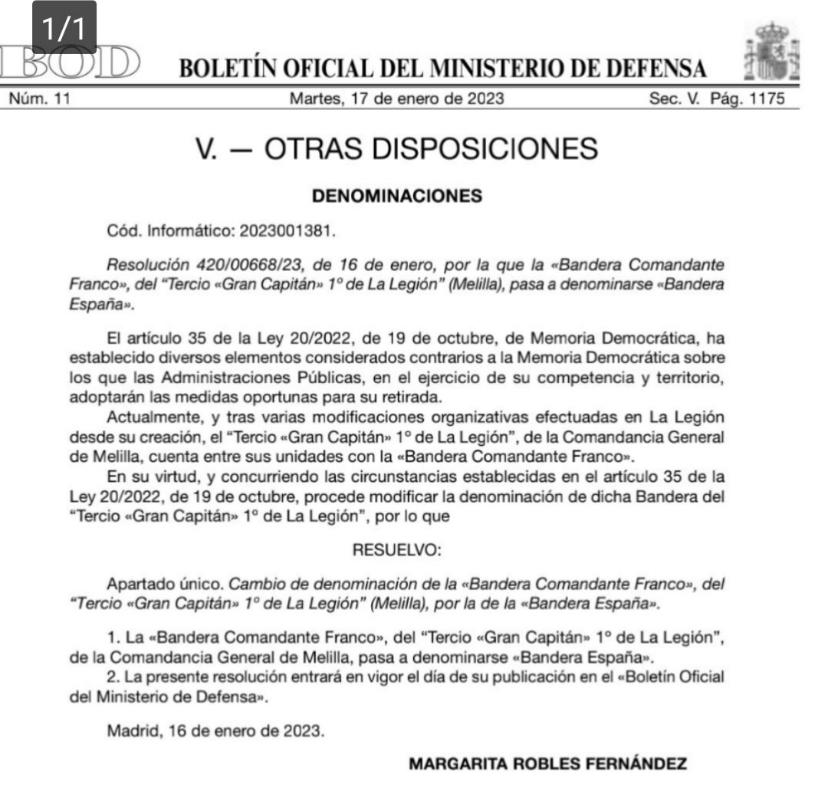 Por Resolución de la ministra de Defensa, se cambia el nombre y pasa a denominarse: “Bandera España”. Así sin más explicación que la razón de una ley que está por ver si tiene razón y responde a razones de ¿convivencia o enfrentamiento?, ¿históricas o venales?, elaboradas con tinta roja como la de aquellos sótanos de humedades donde se parió la interpretación de la Ley.