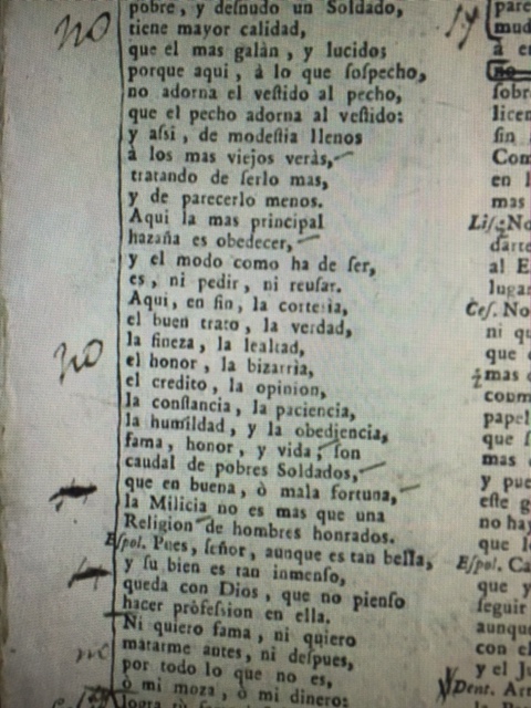 Preguntas de soldado que mira atónito su misión y la legislación. “Aquí la más principal hazaña es obedecer, y el modo cómo ha de ser es ni pedir ni rehusar. Aquí, en fin, la cortesía, el buen trato, la verdad, la fineza, la lealtad, el honor, la bizarría; el crédito, la opinión, la constancia, la paciencia, la humildad y la obediencia, fama, honor y vida son, caudal de pobres soldados; que en buena o mala fortuna, la milicia no es más que una religión de hombres honrados”.