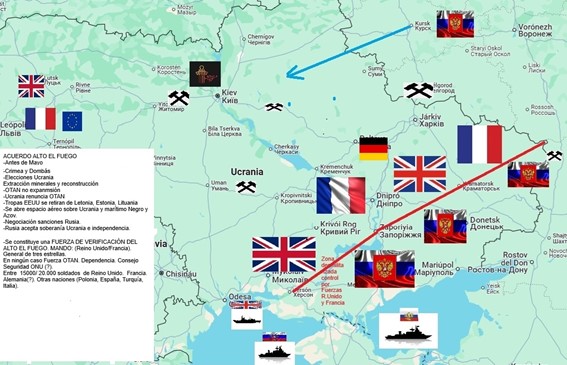 -Fuerza de Verificación Alto el Fuego a lo largo de la actual línea del frente con Reino Unido y Francia (¿Alemania?). Otras: España, Italia, Polonia, Turquía… Entre 15 y veinte mil hombres.