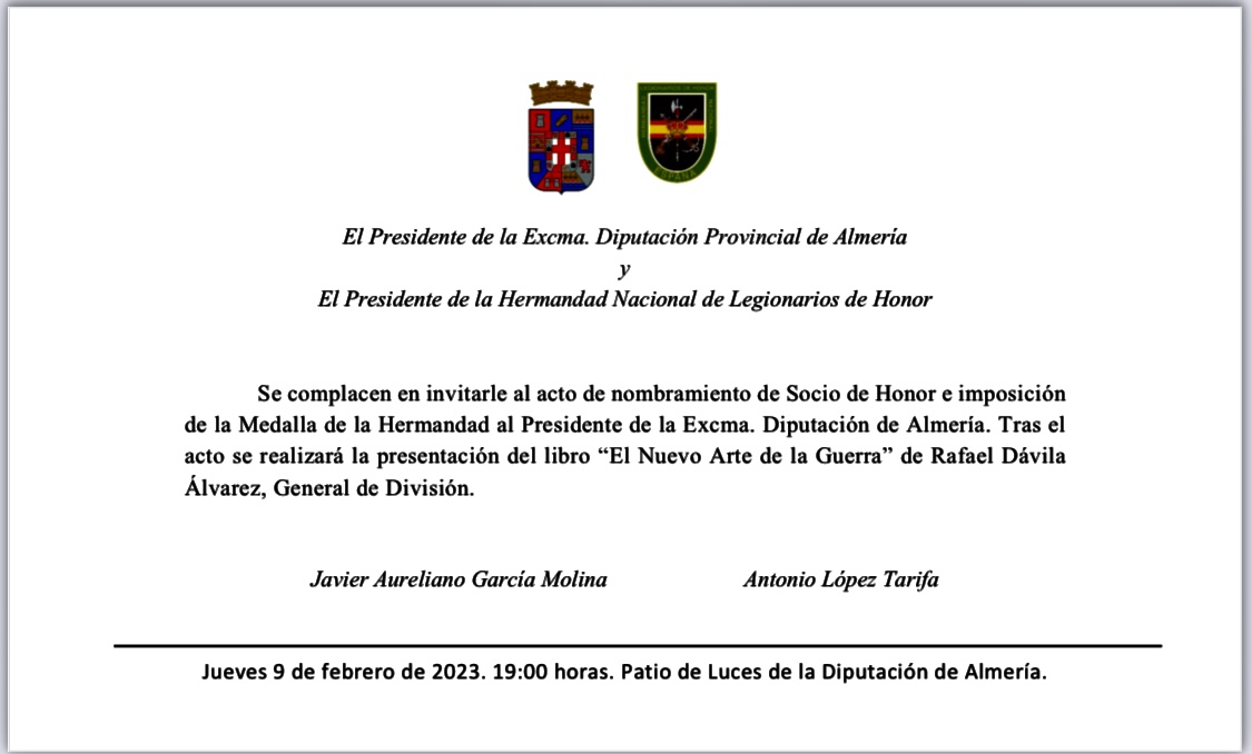 El pasado jueves día 9 estuve en Almería presentando mi libro El nuevo arte de la guerra. Todo surgió a petición de la Hermandad Nacional de Legionarios de Honor que preside D. Antonio López Tarifa y con la ayuda de su espléndido Secretario D. Francisco A. Megías Olvera.