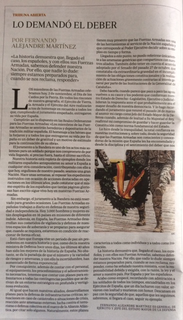 El Ejército español es quizá el mejor Ejército del mundo, sin exageraciones, por sí mismo, sin contar armas y municiones. Somos un ejemplo en virtudes y eficacia en lo que es difícil que otro pueda competir. Eso ocurre desde hace tantos años como ejércitos tenemos, y ya nuestros tratadistas militares siempre se fijaron más en la virtud, algo que no ha ocurrido con los de otras naciones, que en los medios y organización, por otro lado históricamente lamentable.