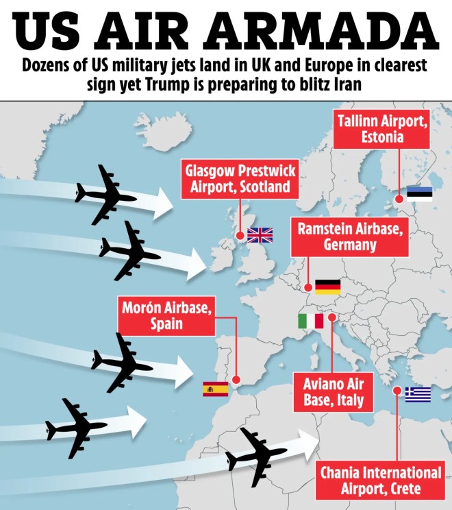 Por lo pronto lo inaudito ocurre: las base españolas usadas por la aviación estadounidense de repente se llenan con sus aviones de guerra. Morón. ¿Dónde irán?