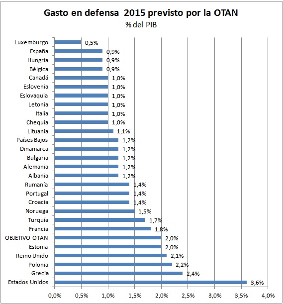 España, con un 0´9% del PIB es el farolillo rojo en gasto militar de las naciones integrantes de la OTAN. Turquía con un 1´7% está próximo al objetivo marcado por la Alianza (2%).